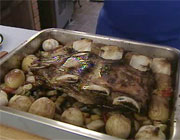 4 - Em volta distribua as batatinhas, com casca e tudo, bem lavadas e as cabeças de alho, com casca também.